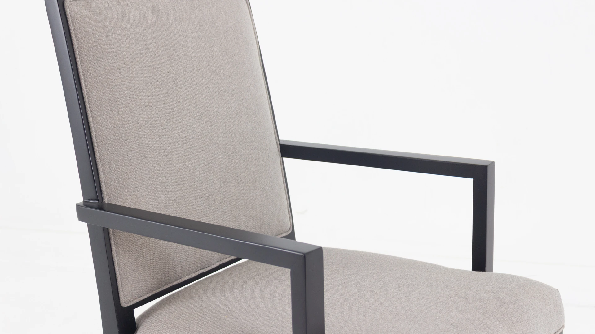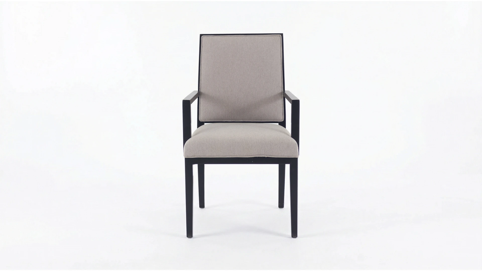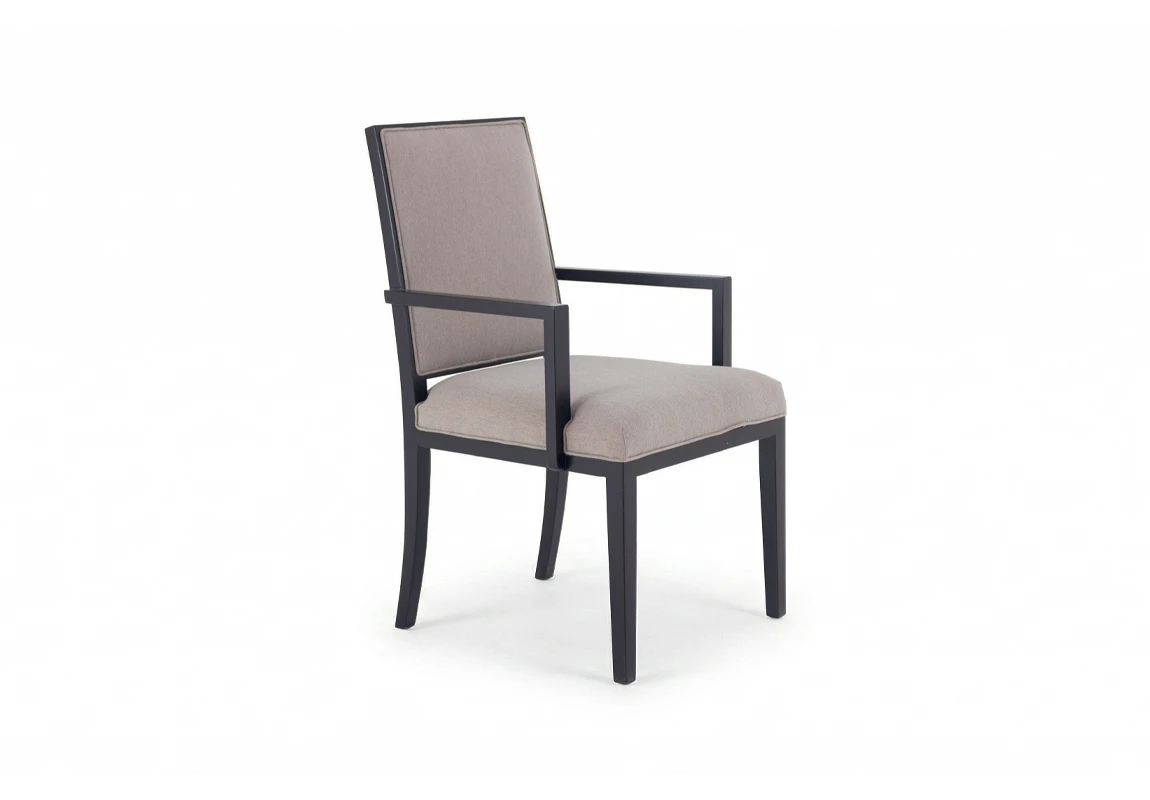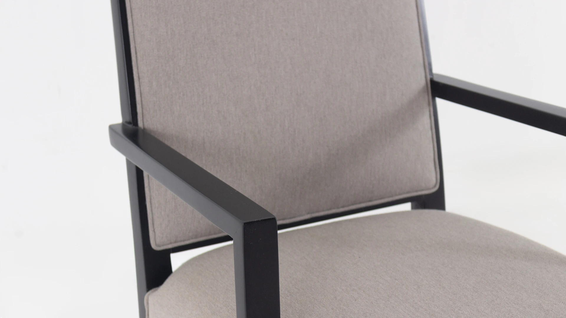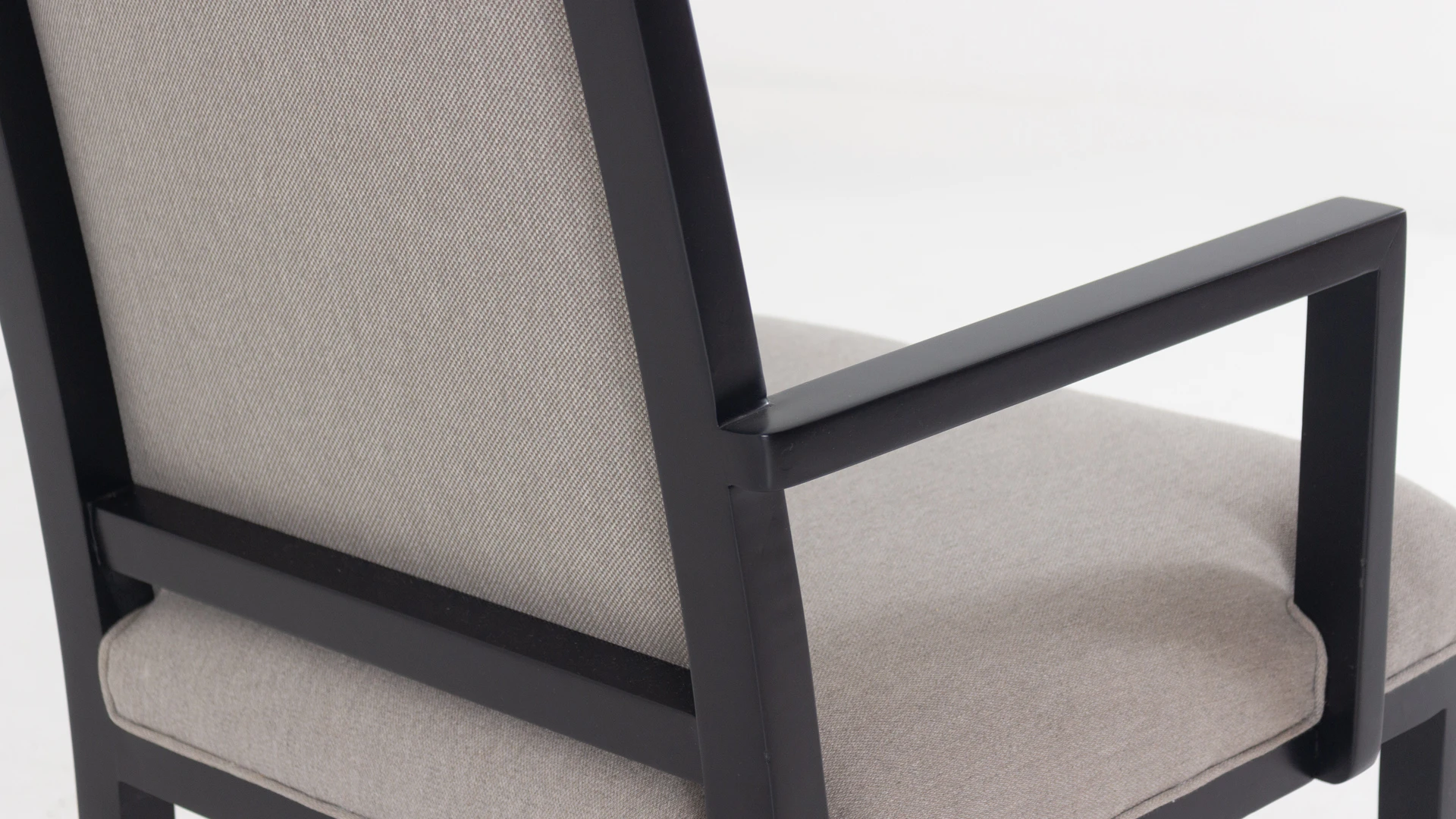 Sillón de comedor Bruni Con diseño contemporáneo, tapizado en tela Mobili thunder. Estructura con lustre negro semi mate, de líneas definidas y apoyabrazos integrados. Producto de edición limitada. Consultar stock disponible. Precio final con descuento, incluye IVA y género. Para customizaciones que requieran un nuevo proceso de fabricación, se realizará una cotización especial.